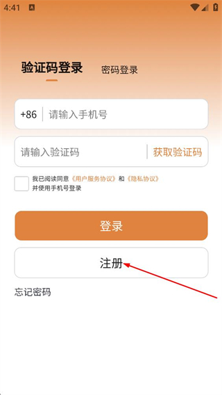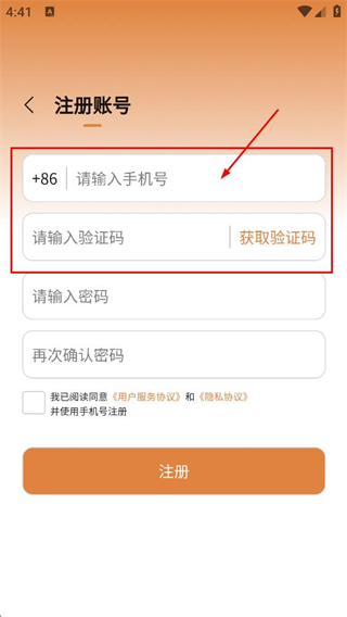 2、在注册账号页面,填写手机号,点击获取验证码后,填写对应的验证码。