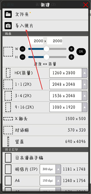 3、在弹出的新建菜单中,点击导入照片选项。