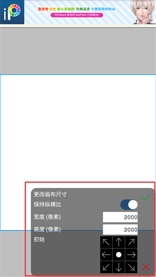 4、在更改画布尺寸界面中,调整完宽度与高度参数,点击对勾。