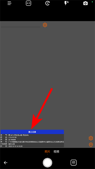 1、打开工程相机APP,在拍摄界面点击下方显示的水印内容区域,进入水印设置页面。