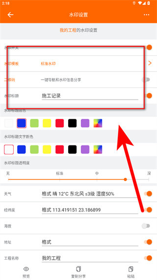 2、在水印设置页面,可以修改水印模板、水印标题等基础信息,还能设置水印标题底色、文字颜色等样式。