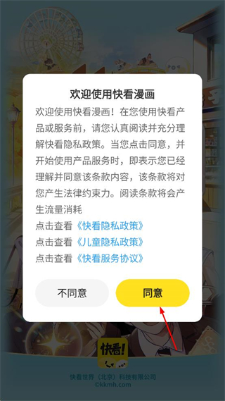 1、阅读弹出的欢迎使用快看漫画相关条款,点击黄色的同意按钮,进入应用主界面。