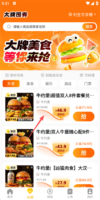 1、在餐大大首页点击底部的大牌选项,进入大牌国券页面。