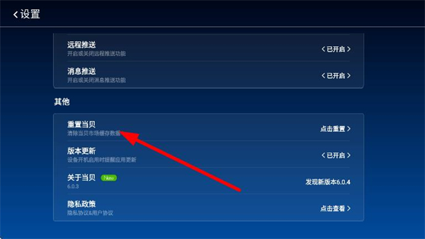 3、找到并点击清除当贝市场缓存选项,即可完成缓存垃圾清理。