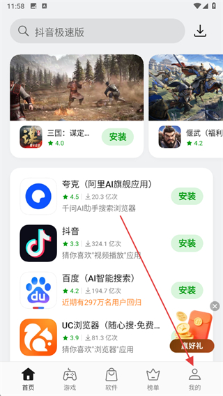 1、打开OPPO软件商店,在首页点击底部的我的选项。