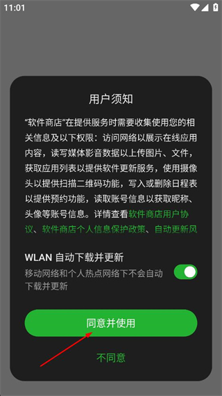 1、查看弹出的用户须知内容,确认相关权限说明,点击同意并使用按钮进入软件。