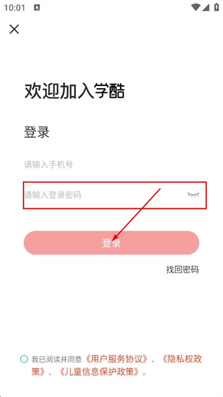 1、阅读用户服务协议和隐私权政策后,点击同意,进入学酷的登录页面。