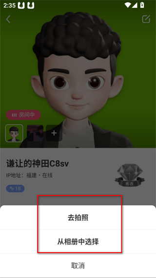 4、在菜单中选择拍照或从相册中选择,挑选新头像图片后完成设置即可更换头像。
