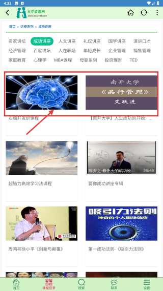2、在课程分类页面,找到“讲座系列”下的成功讲座分类,进入对应课程列表。