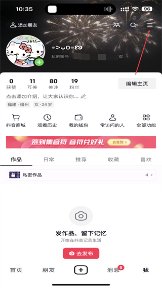 2、在个人页面中点击右上角三条横线图标,弹出功能菜单。