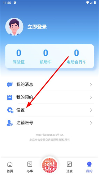 1、在北京交警app我的页面,点击设置选项,触发登录方式选择的弹窗。