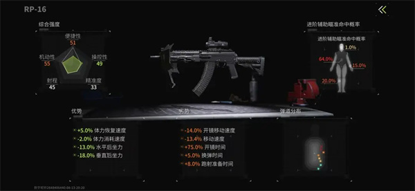 在改装台时,可以点击枪械强度详情页面查看优劣属性情况,同时右侧会显示这把枪在开启进阶辅助瞄准时的部位命中概率。如图示,这把RP-16开启进阶辅助瞄准时头部命中概率是1%,躯干64%,手臂15%,腿部20%。了解具体的数值才能更好发挥进阶辅助瞄准的优势。