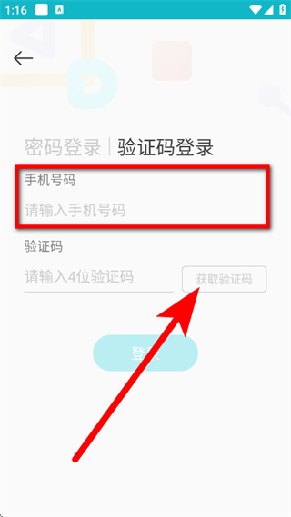 3、在验证码登录页面,输入手机号码,点击获取验证码。