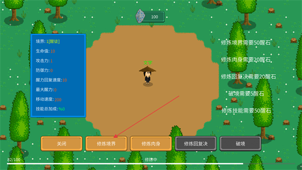 4、点击修炼境界选项提升实力,为修炼技能奠定基础。