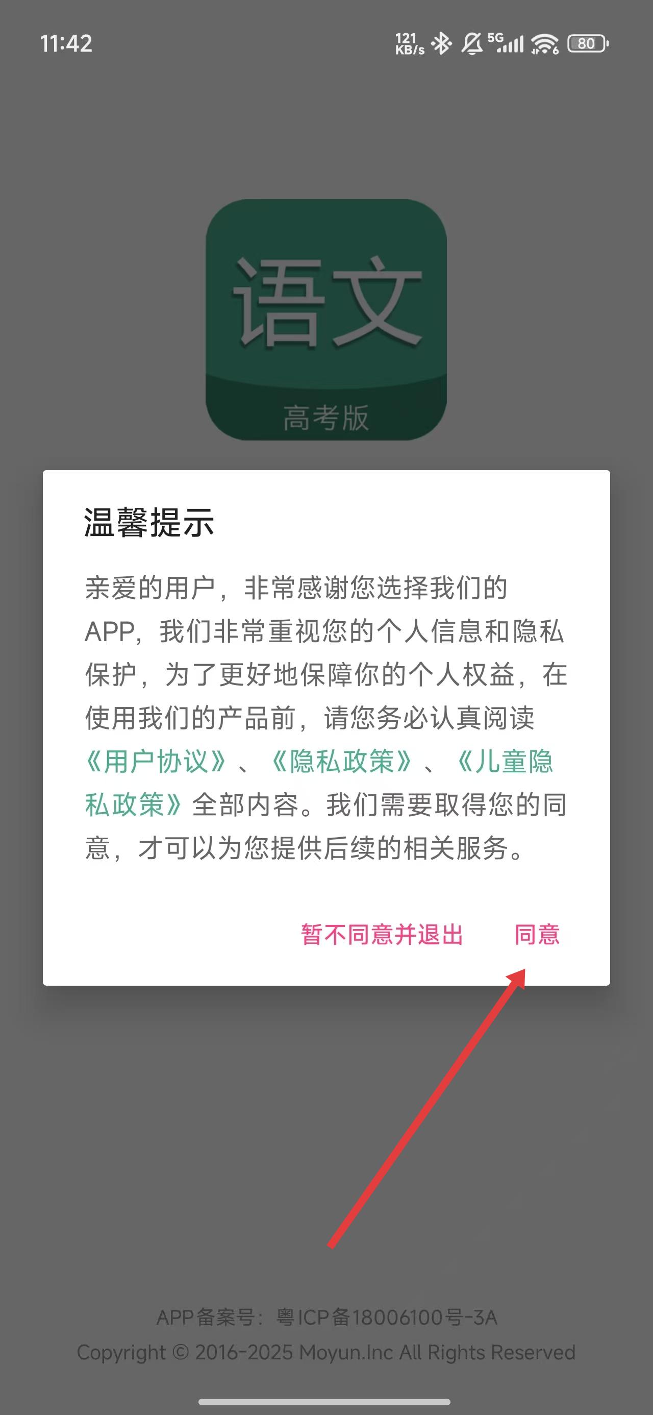 1、在点开高考语文通app时,点击弹窗中的同意按钮,进入使用。