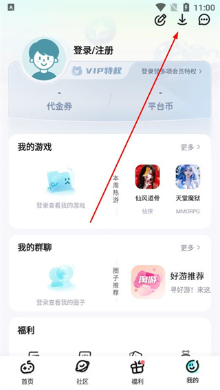 2、在个人中心页面,点击右上角的下载图标,进入下载管理页面。