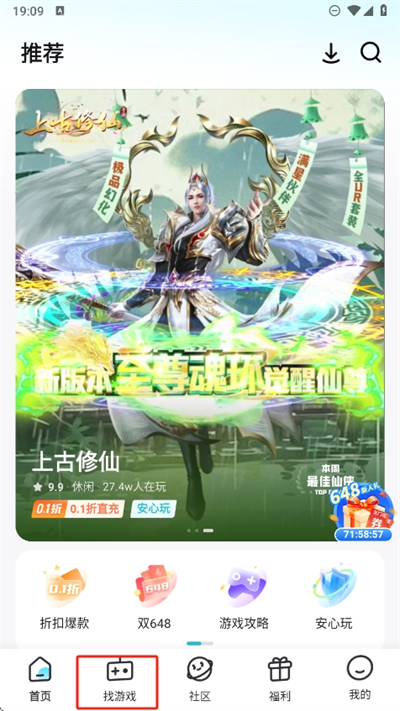 1、进入软件的首页能看到平台推荐的一些热门游戏,我们还可以去找游戏这里找寻更多的作品;