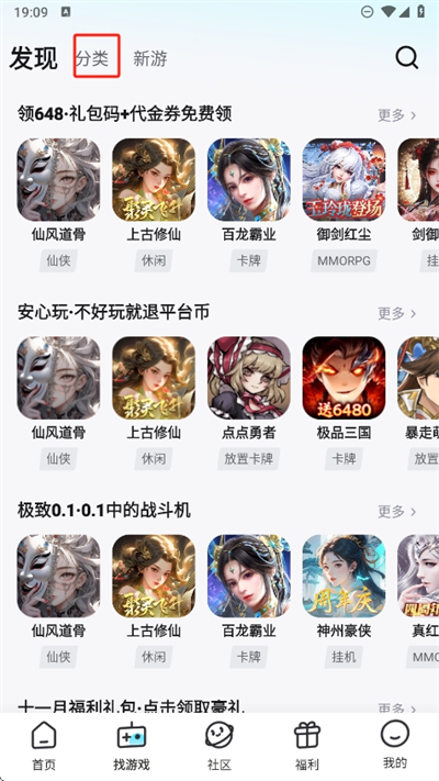 2、进入发现页面找寻游戏时,可以选择分类查看更多的游戏并进行了解和下载非常简单;