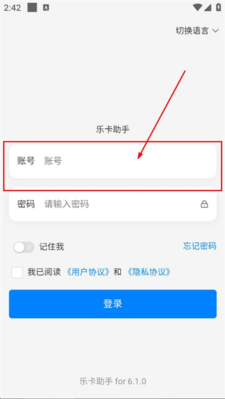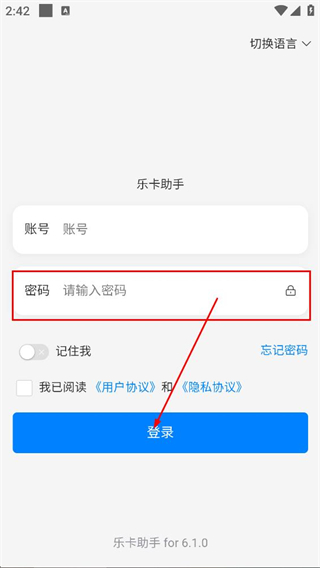 2、随后我们可以在乐卡助手的登录页面,即可填写账号对应的内容。
