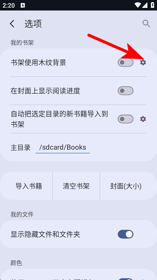 3、在设置页面中,找到书架使用木纹背景选项,点击其右侧的设置图标。