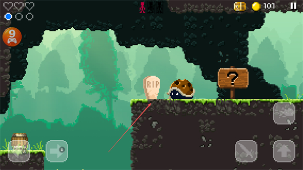 2、探索带问号木牌区域,躲避蜗牛敌人,留意“RIP”标识的危险区域,继续前进。