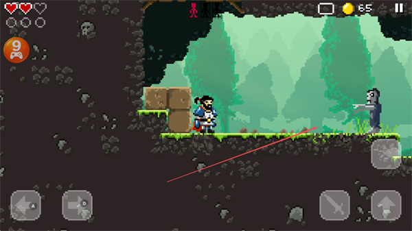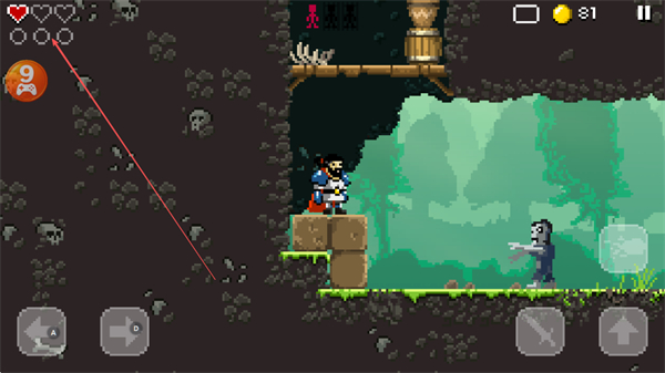 4、在多平台洞穴中移动,躲避骷髅装饰的危险区域,攻击僵尸敌人,收集金币,推进关卡。