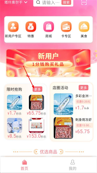 1、进入圈惠团后,点击限时抢购板块的更多按钮,可进入限时抢购商品列表页面。