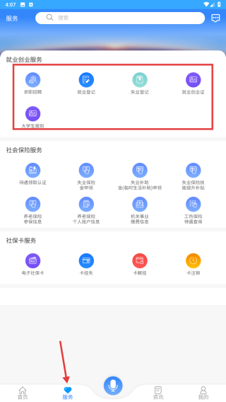 2、点击底部服务选项,进入服务页面,能使用就业创业服务求职招聘、就业登记等、社会保险服务等功能。