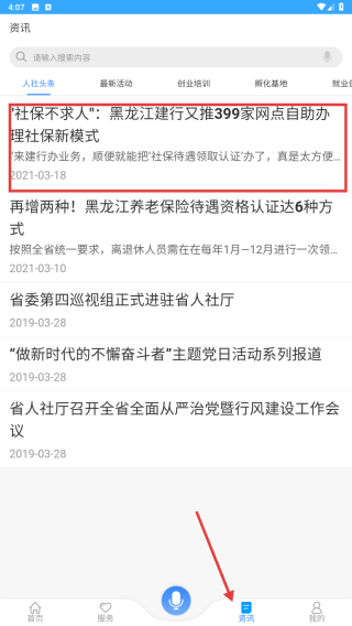 3、点击底部资讯选项,进入资讯页面,可浏览社保等相关政务新闻,如“社保不求人”等报道。