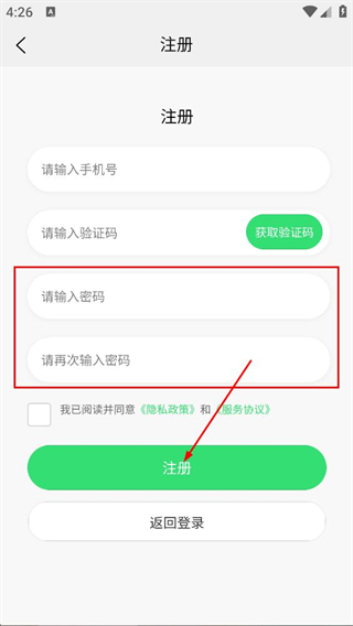 4、在注册页面,填写请输入密码和请再次输入密码,点击注册完成注册操作。