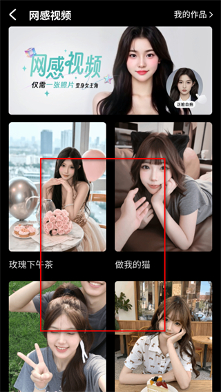3、选择网感视频中的模板,玫瑰下午茶做我的猫等,进入模板详情页。