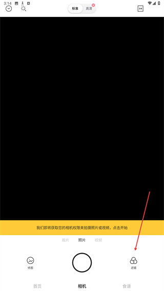 1、打开foodie相机的App,进入时点击右下方滤镜的按钮。