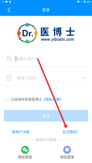 1、在医博士登录界面中,如果忘记了密码可以点击下方的忘记密码按钮进行解决。