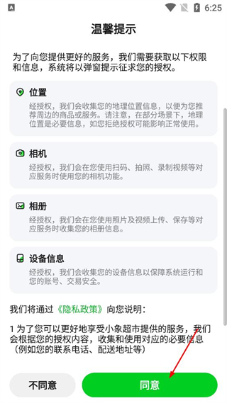 1、在温馨提示弹窗中,点击同意按钮,授权应用所需的权限信息。