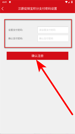 4、进入支付密码设置页面,设置并确认支付密码,点击确认注册按钮,完成账号注册流程。