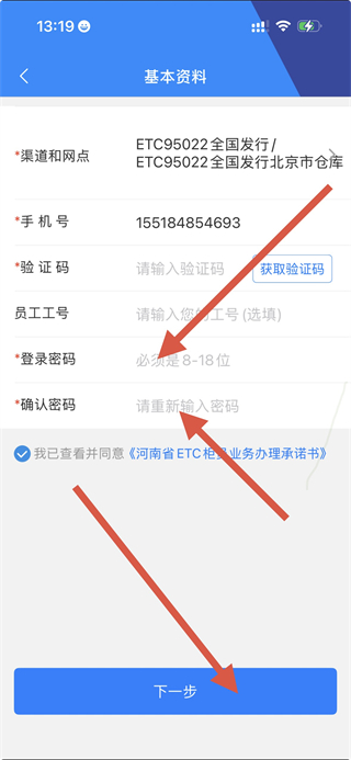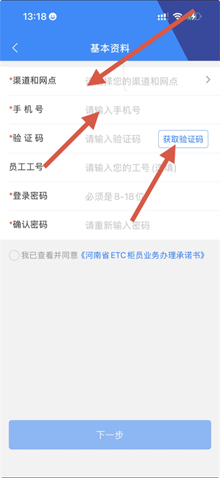 2、在基本资料页面,选择渠道和网点,输入手机号,点击获取验证码并输入。