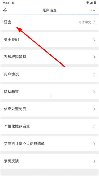 3、在账户设置页面,点击语言选项,弹出语言选择列表。