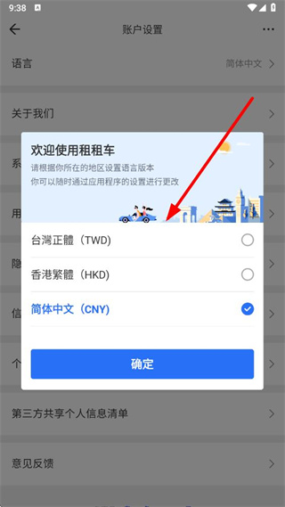 4、在语言选择列表中,选择想要设置的语言,点击确定即可完成租租车语言的修改操作。
