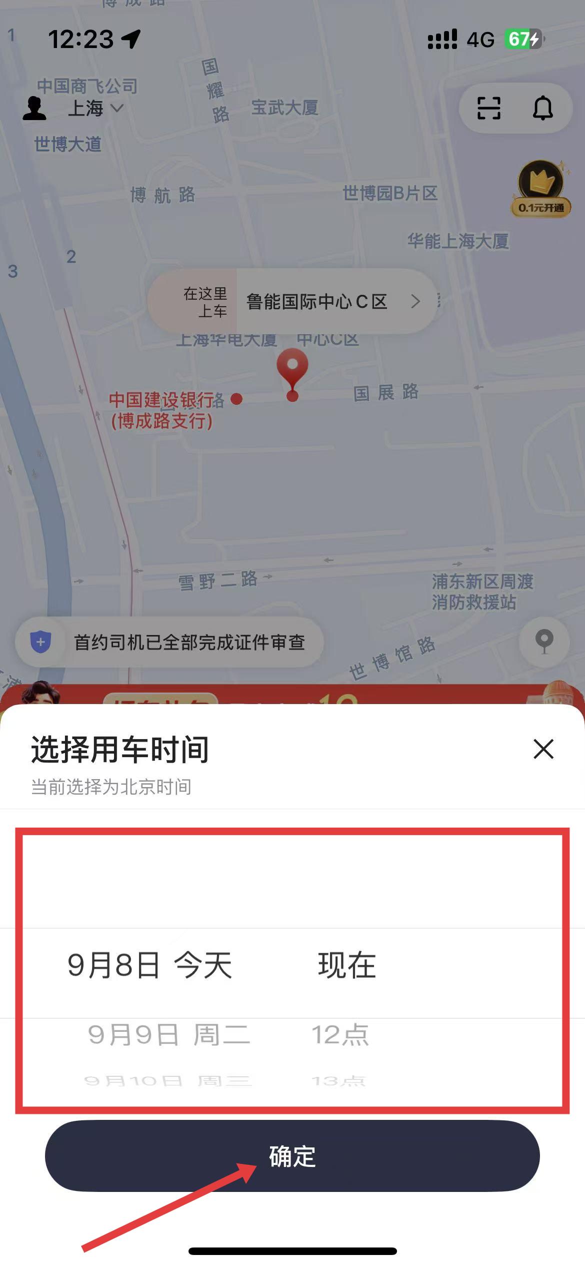 2、在弹出的选择用车时间界面中,选择你需要用车的日期和具体时间,然后点击确定按钮。