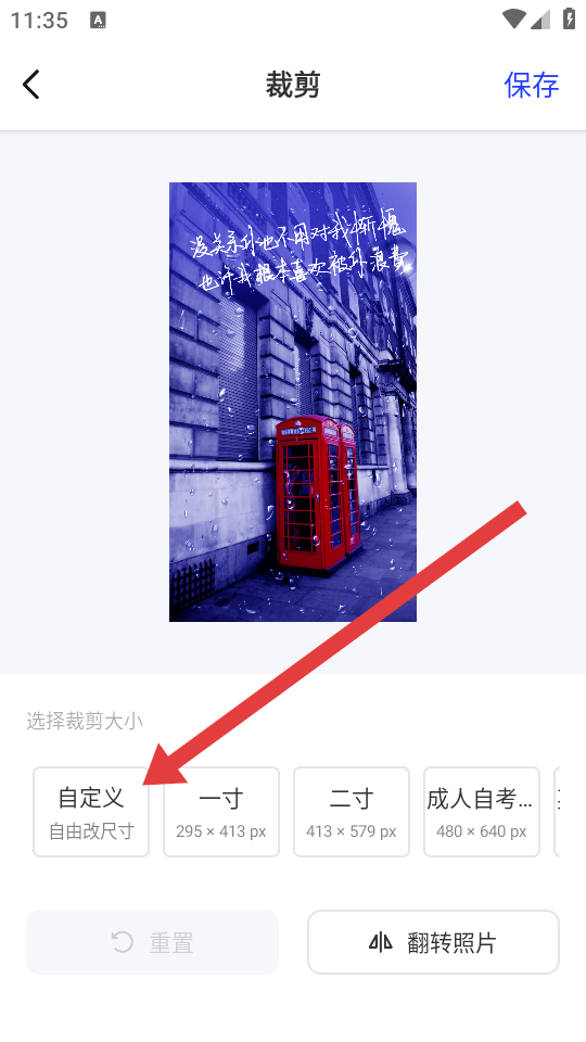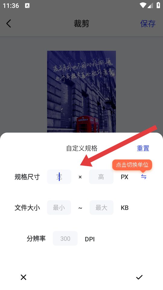 3、在裁剪的页面,点击自定义的选项,弹出自定义规格设置的弹窗。