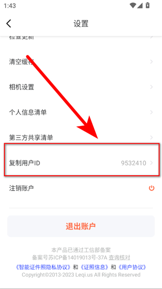 3、在设置页面找到复制用户ID选项,即可查看用户ID号码。
