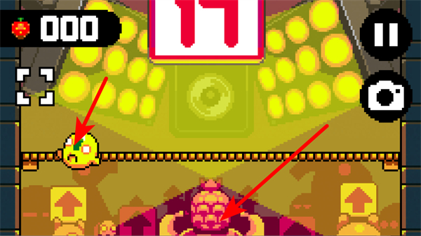 2、在游戏界面,操控黄色角色躲避障碍,同时注意下方的怪物。