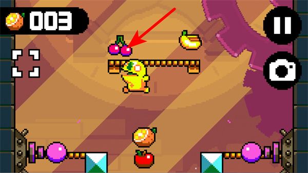 3、在游戏过程中,角色可借助道具前进,收集上方的水果等物品。