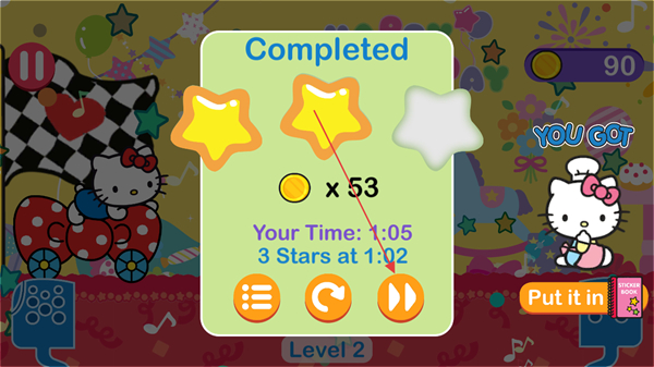 1、在Level2跑道上,驾驶凯蒂猫小车收集金币,利用彩虹道具获取额外金币。