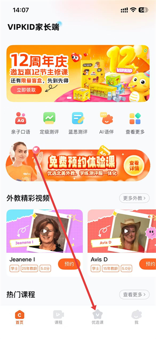 1、打开vipkid app,点击底部导航栏中的优选课选项。