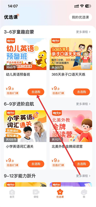 2、在优选课页面,找到想要购买的课程,点击去选购。