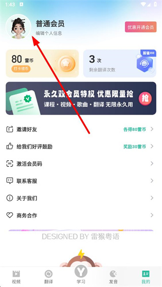 1、在粤语学习app界面,点击右下角我的,进入个人页面。