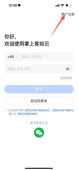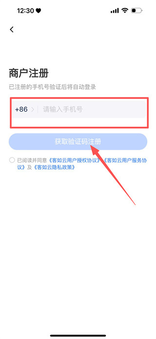 3、在商户注册页面,输入手机号,点击获取验证码注册。