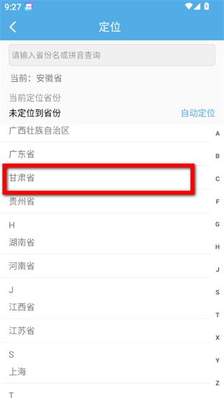2、在省份选择界面,找到并点击目标省份如甘肃省,完成省份切换。