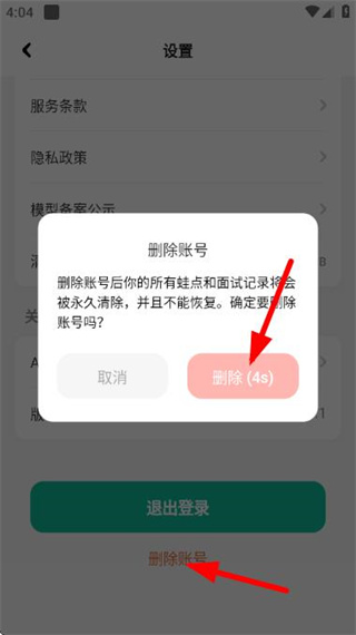 3、在设置页面点击删除账号,在弹出的确认框中点击删除,完成账号注销操作。